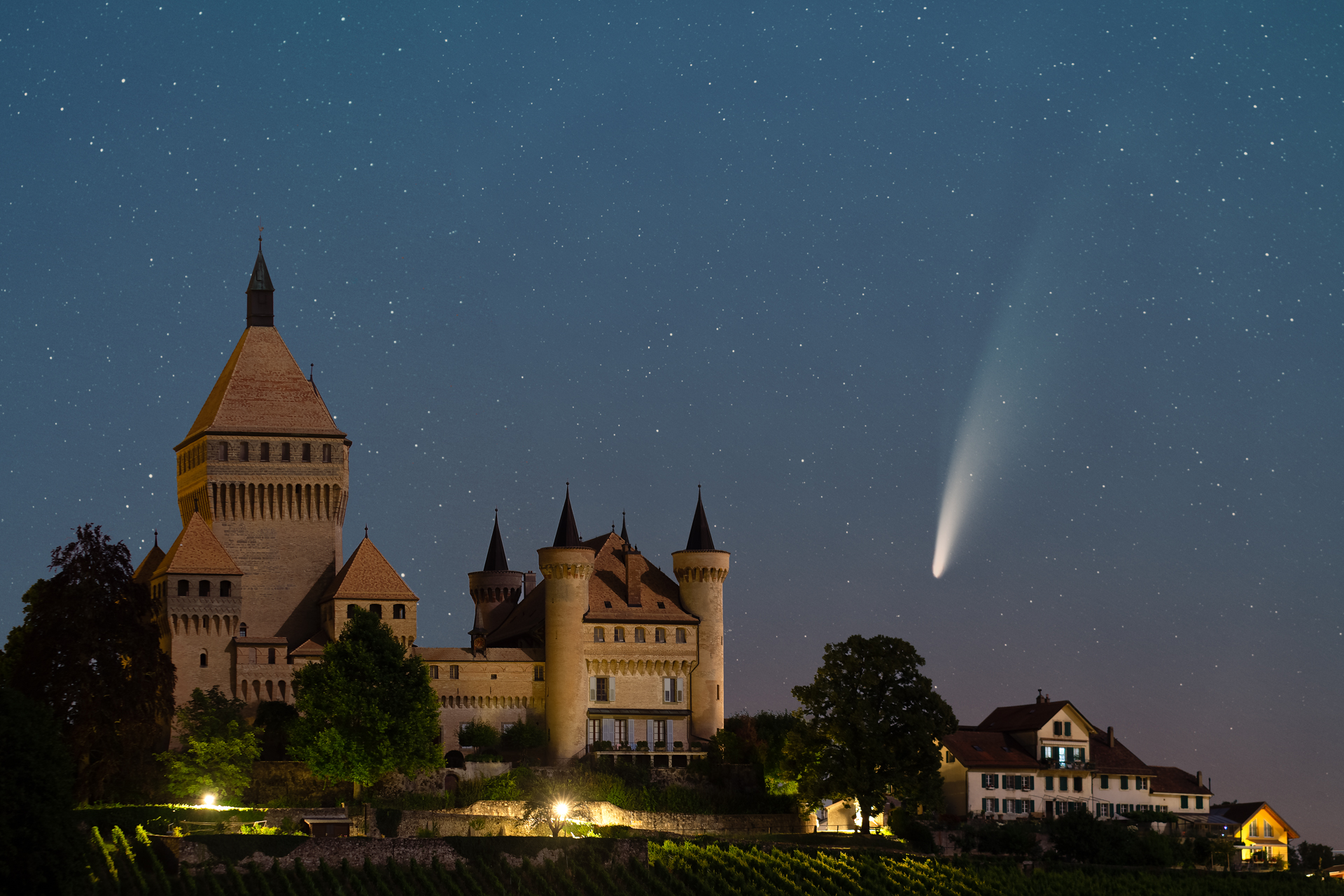 Comet NEOWISE lit up the nights of July 2020. Easily visible to the naked eye, it is considered the third great comet of the 21st century. Here it rises behind Vufflens castle.